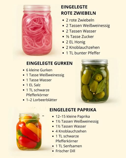 Sauerkonserven sind eine großartige Möglichkeit, den Geschmack des Gemüses zu bewahren und die Vielfalt der deutschen Küche zu genießen. Mit einfachen Zutaten und ohne lange Fermentation kannst du drei beliebte Gemüsearten in aromatische Konserven verwandeln: eingelegte rote Zwiebeln, Gurken und Paprika. Diese frisch eingelegten Köstlichkeiten passen perfekt zu Käse, Fleisch oder als Beilage und eignen sich auch wunderbar als Geschenk.