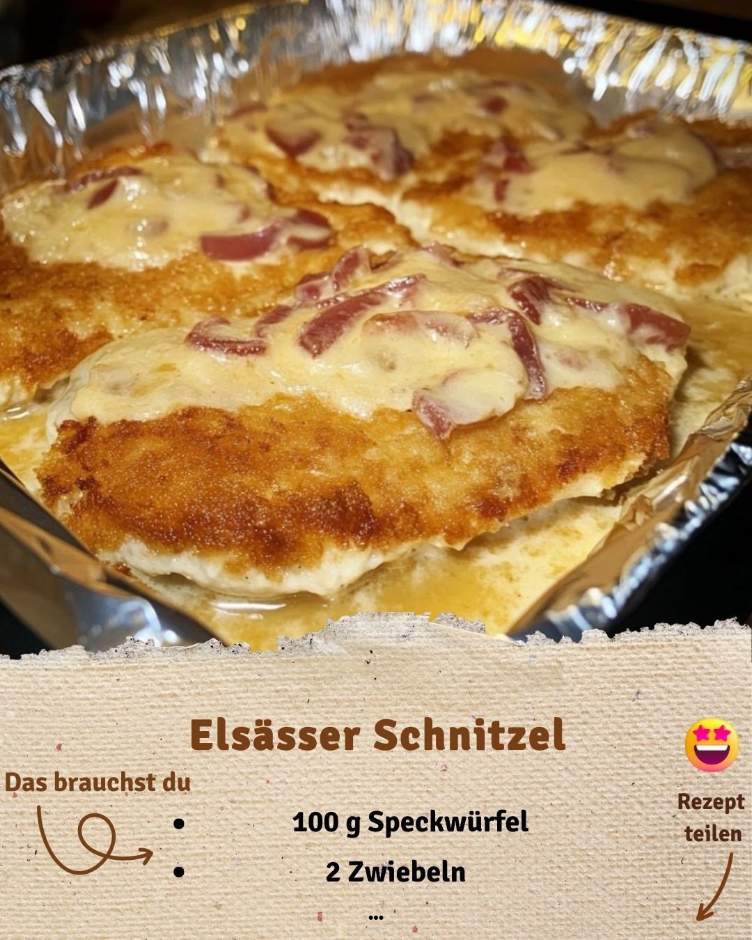 Dieses Schnitzel kommt nicht aus der Pfanne, sondern aus dem Ofen – überbacken mit herzhafter Crème fraîche, Röstzwiebeln & Käse