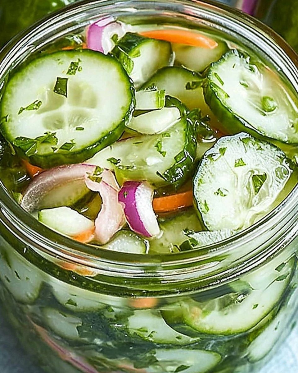 Dieser frische eingelegte Gurkensalat hält im Kühlschrank bis zu zwei Monate – aber so lange überlebt er nie! Je länger er zieht, desto besser schmeckt er. Ich liebe ihn als Snack. Ergibt ca. 2 Liter.