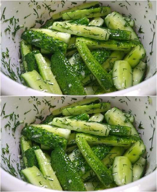 Den Dill fein hacken, den Knoblauch in Scheiben schneiden und zu den Gurken geben, salzen. Alles gut vermischen und 30 Minuten kühl stellen, um zu marinieren.