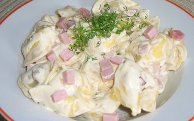 Zutaten 2 Pck. Tortellini 1 Pck. Sahne-Schmelzkäse 200 ml Sahne 250 ml Gemüsebrühe 100 g Schinken, gewürfelt Zubereitung Das…