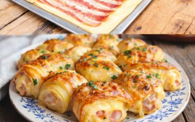 Zutaten: 250 g Blätterteig 75 g Bacon (6–8 Scheiben), knusprig gebraten 100 g geriebener Käse 1 Ei, verquirlt 1 g getrocknete Kräuter (optional) Zubereitung:…